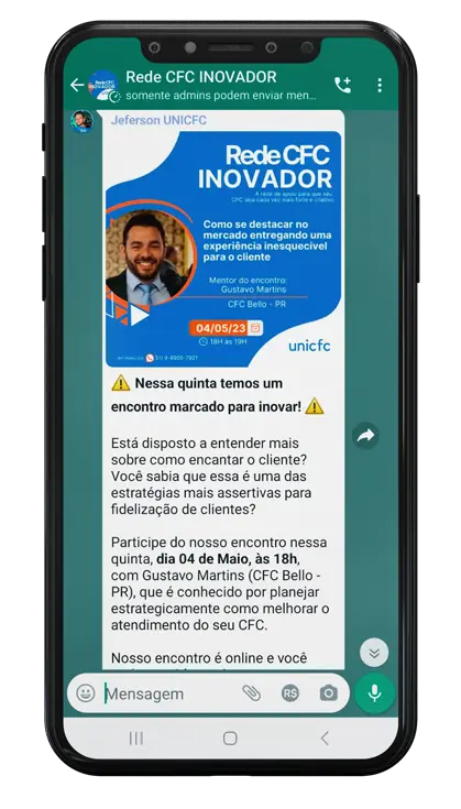 Abra as portas para um espaço único no WhatsApp da UNICFC onde a excelência e a inovação se entrelaçam para moldar o futuro do setor.